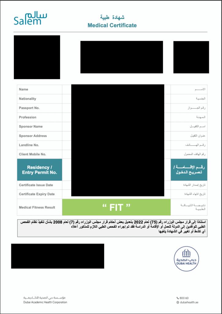 The DHA Medical Fitness Certificate is valid for 90 days from the date of issue. If you don’t complete your visa process within this period, you’ll need to undergo testing again.